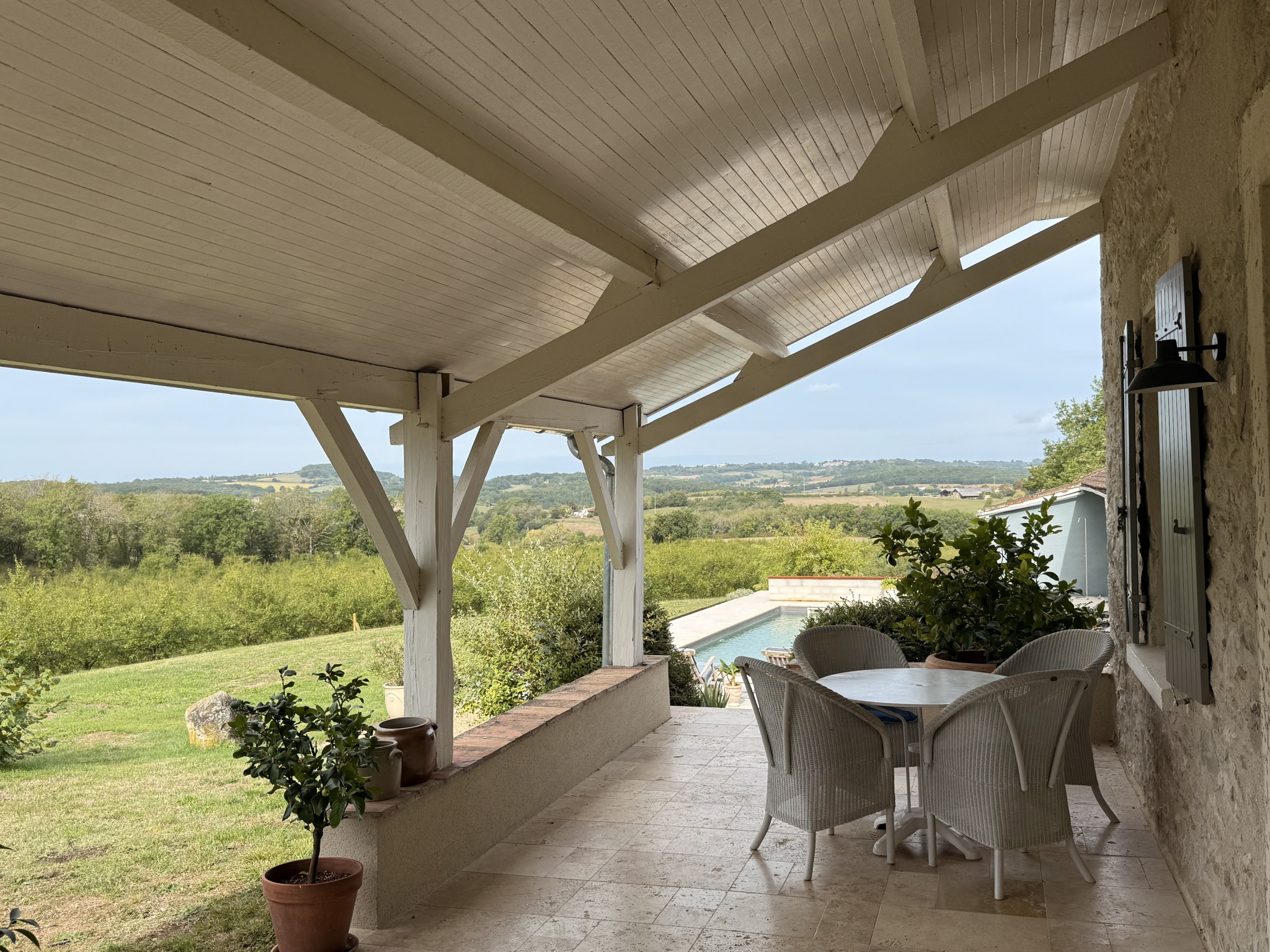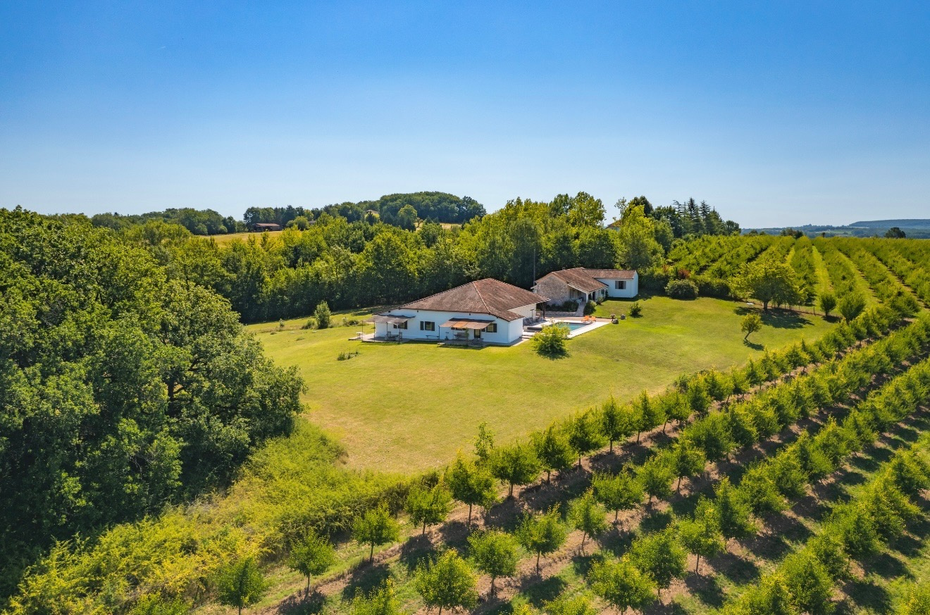 \nNichée au sommet d?une colline, cette ancienne ferme en pierre datant du début du XIXe siècle a été entièrement transformée ces dernières années pour offrir un cadre de vie mêlant charme authentique et confort moderne. Depuis la terrasse et la piscine au sel de 10 x 5 mètres, le regard se perd sur un panorama magnifique, sans aucun vis-à-vis, dans une atmosphère de calme absolu.\n \nLa maison principale s?accompagne de deux gîtes indépendants, tous deux soigneusement aménagés avec cuisine équipée, salle d?eau moderne et mezzanine permettant d?offrir des couchages supplémentaires. Cet agencement en fait le lieu idéal pour accueillir une grande famille ou développer une activité d?hébergement touristique. Aucun travaux n?est à prévoir puisque tout a été rénové avec soin et même la fosse septique est déjà aux normes en vigueur.\n \nL?environnement naturel est exceptionnel avec des sentiers de randonnée qui passent à l?entrée de la propriété et permettent de profiter de kilomètres de balades dans une campagne préservée. À seulement quelques minutes, les bastides médiévales animent la région avec leurs marchés colorés, leurs terrasses de cafés et leurs restaurants conviviaux. Monflanquin, classé parmi les plus beaux villages de France, se trouve à moins de dix minutes et séduit par son marché du jeudi matin et son atmosphère chaleureuse. Villeréal, Monpazier, Penne-d?Agenais et d?autres villages de caractère complètent ce tableau typique du Sud-Ouest.\n \nCette propriété au charme unique réunit tous les atouts recherchés avec sa situation dominante, sa tranquillité absolue, sa proximité des commerces et ses prestations irréprochables. Elle n?attend plus que vous.\n \n