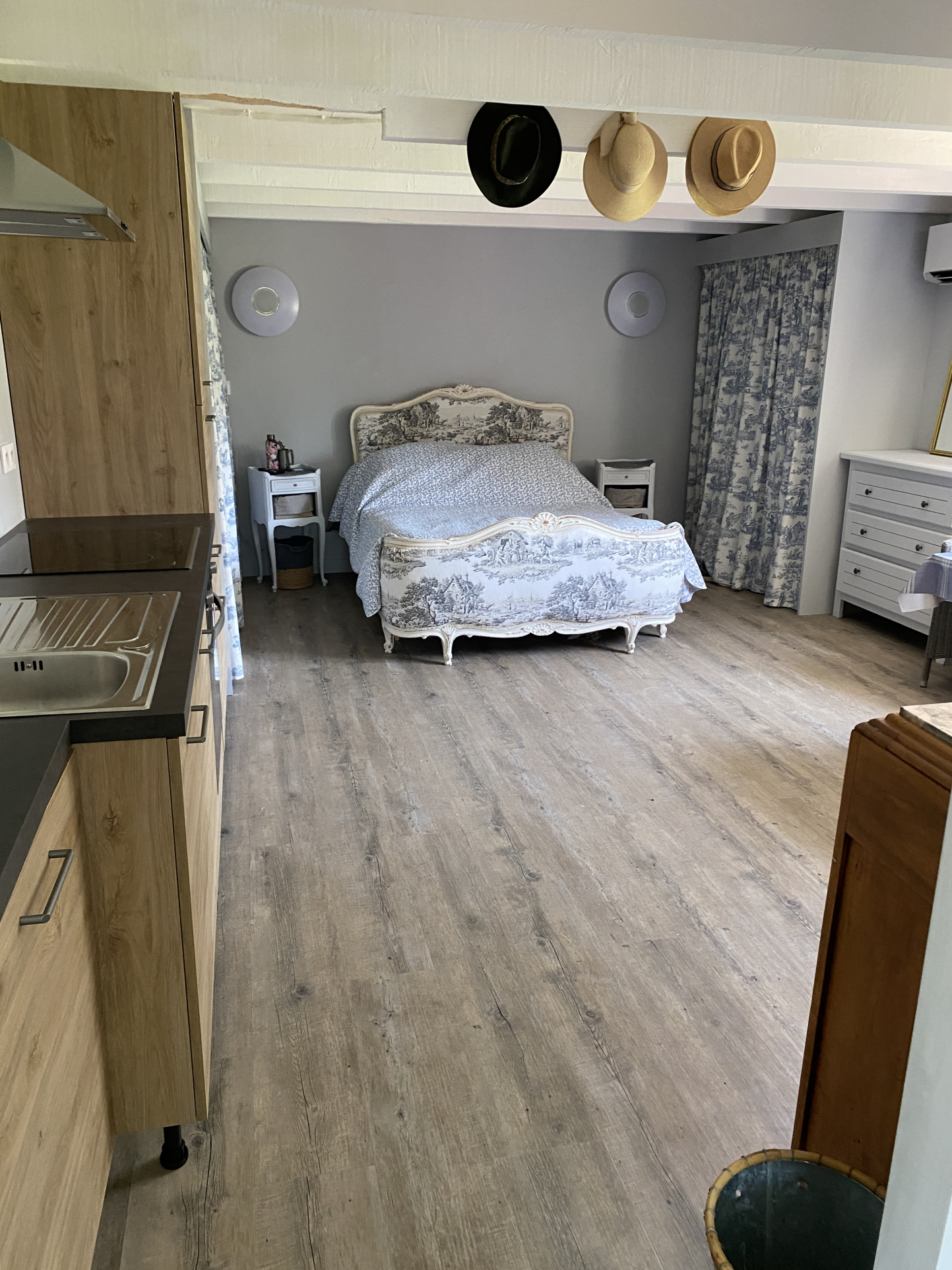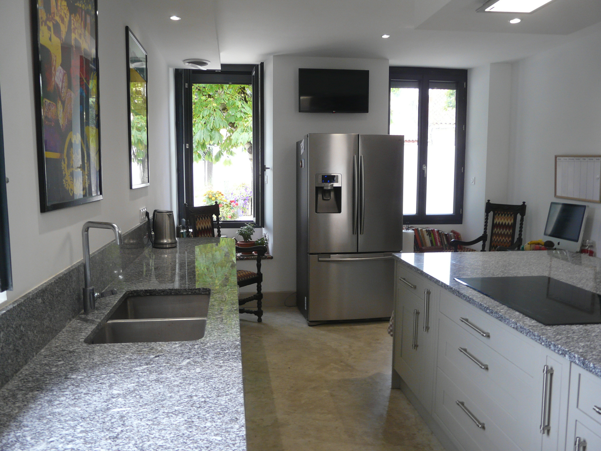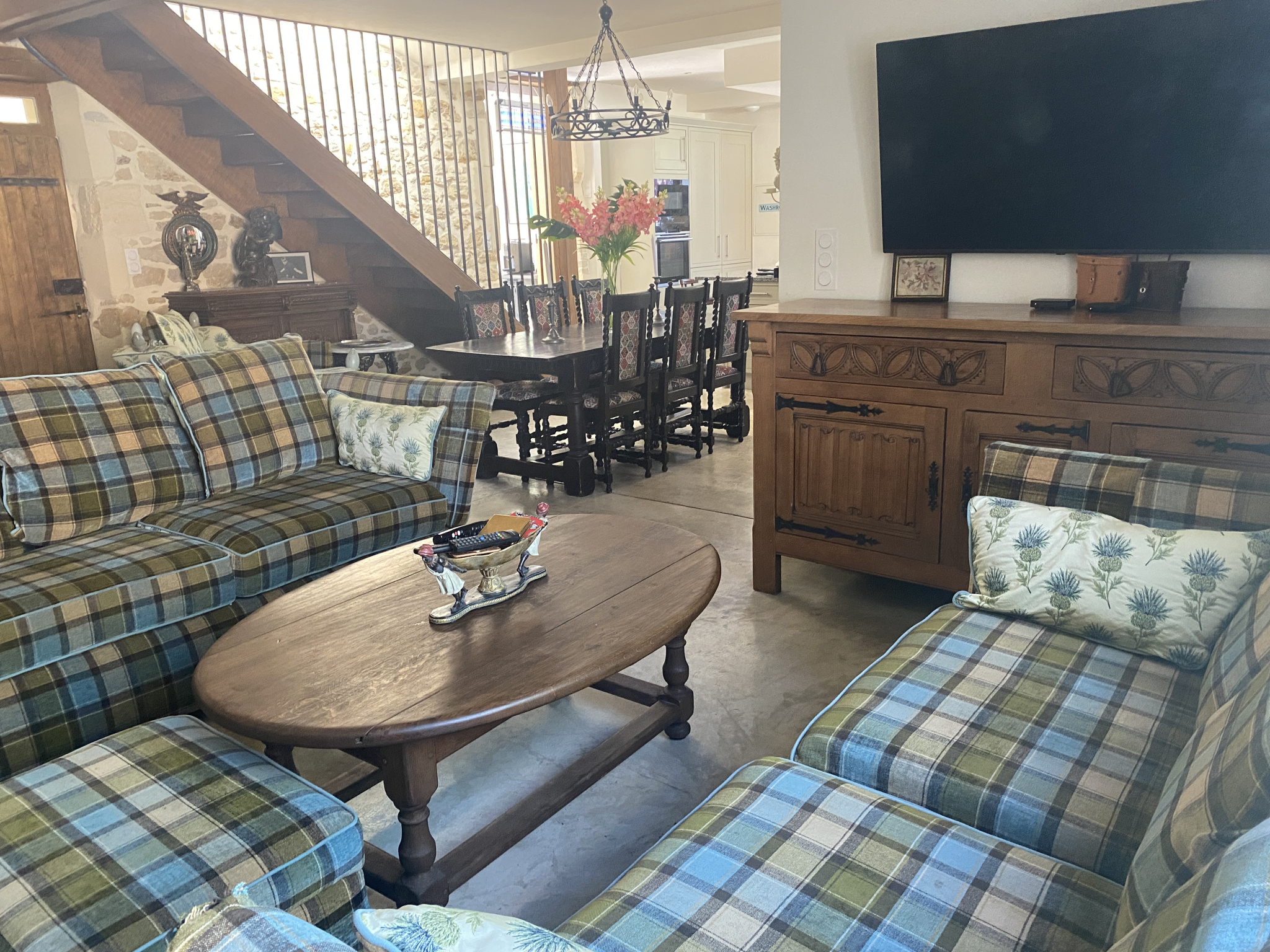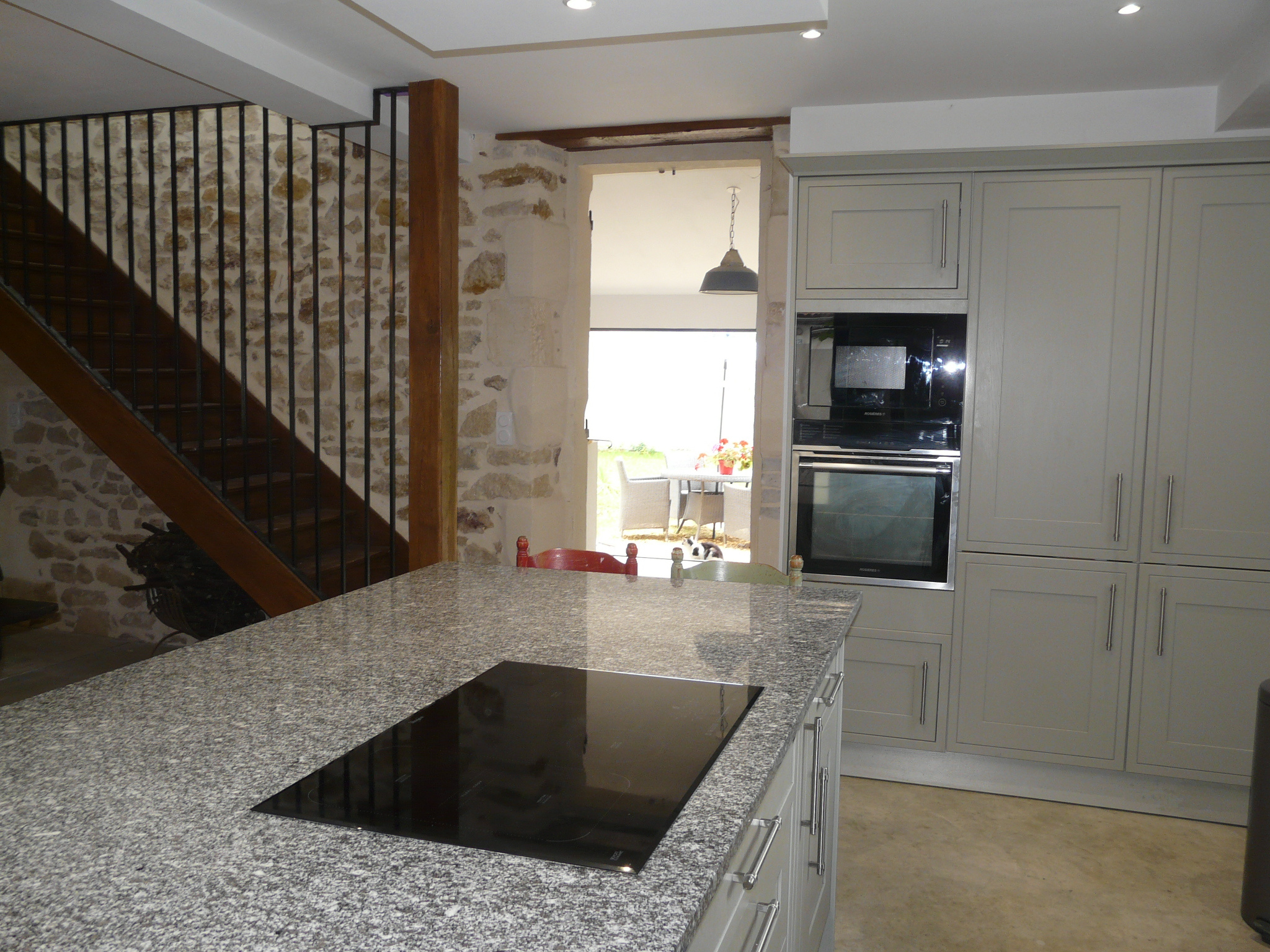 Elle se compose d'un grand séjour /salon équipé d'un poêle Godin, une cuisine aménagée et équipée ouverte et spacieuse,